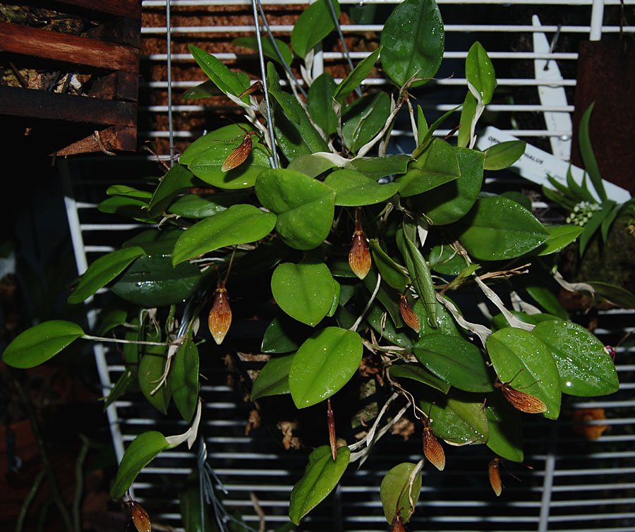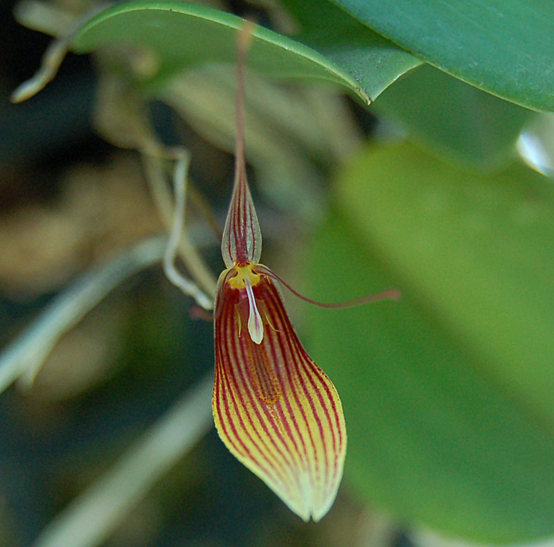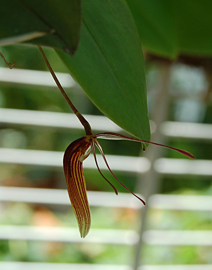 | Restrepia lansbergii - another adorable buggy little flower. I got this one last September from Hoosier Orchids. The plant is still small, I will move this one also over to a basket. Rainwater only! |